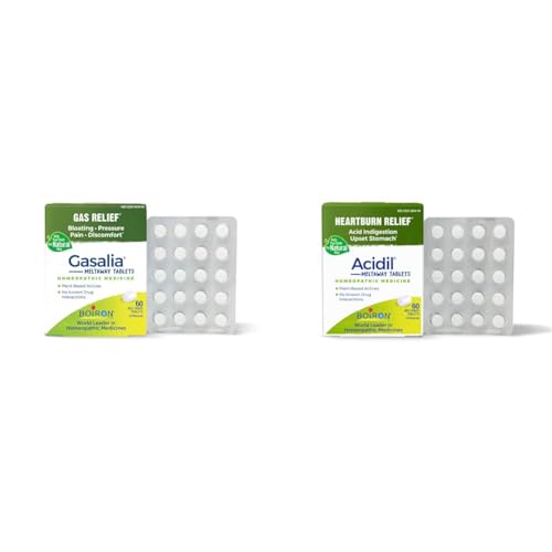 Specification: Boiron Gasalia Tablets and Acidil Tablets for Gas, Bloating, Acid Reflux, Heartburn, Indigestion, and Upset Stomach Relief – 60 Count Each