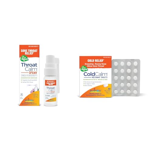 This convenient bundle pairs Boiron’s ThroatCalm Spray and ColdCalm Tablets to provide soothing relief for sore throats and cold symptoms. The .68 fl oz ThroatCalm Spray delivers a cooling mist containing plant-based active ingredients like Echinacea to relieve minor sore throat pain on contact. The spray’s mint-like herbal flavor provides a refreshing taste. Its unique nozzle allows for precise, gentle application wherever needed. The 60-count ColdCalm Tablets target sneezing, runny nose, nasal congestion, and sore throat at all stages of a cold. The fast-dissolving homeopathic tablets melt in the mouth without water for easy use anytime. Together, these products offer multi-symptom cold and sore throat relief. The plant-powered spray eases throat discomfort while the non-drowsy tablets address head and chest cold symptoms. Both are made by Boiron, a trusted brand for over 90 years, and contain no artificial flavors, colors, or sweeteners. Their complementary forms – spray mist and quick-dissolving tablets – make it simple to get soothing relief on-the-go or at home.