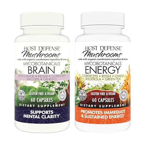 “Explore the numerous health benefits of mushrooms with this Host Defense bundle that includes MycoBotanicals Brain* Capsules and MycoBotanicals Energy* Capsules. MycoBotanicals Brain* Capsules Our carefully crafted blend of Lion’s Mane, Reishi, and Cordyceps mushroom supplement supports brain and adrenal functions. Lion’s Mane supports brain health, clarity, and focus. Reishi supports neurological and adrenal functioning. This herbal supplement is also formulated with Cordyceps to support brain health while aging. The supplement formula has Bacopa and Ginkgo for additional brain health support.* MycoBotanicals Energy* Capsules Each capsule supports immediate and sustained energy and respiratory tract function. Our supplement supports exercise recovery, heart health, and adrenal health. This herbal supplement is formulated with a mushroom blend of Cordyceps, Reishi, and Chaga. This mushroom blend supports sustained energy throughout the day and aids against tiredness. The supplement formula also includes Rhodiola, Eleuthero, and Green Tea to support strength, stamina, and metabolism.* Powered by organic mushroom mycelium, Host Defense products don’t contain any fillers and are third-party tested for quality and safety.* Fungi Perfecti, makers of Host Defense Mushrooms, is a family owned company founded in 1980 by renowned mycologist Paul Stamets with the goal of building the connection between health and beneficial fungi. Our certified organic mushroom mycelium and fruit bodies are grown at our farm near the Olympic Rainforest in Washington State and are sustainably cultivated from responsibly cultured wild strains.* Our mycelium-based mushroom products are non-GMO, gluten-free, and vegan. We are a certified B Corporation and we use eco-conscious packaging that aligns without 110% Climate Positive Commitment. Our continued mission is to explore, study, preserve, and spread knowledge about the use of fungi to help bees, trees, people, and the planet.*”
