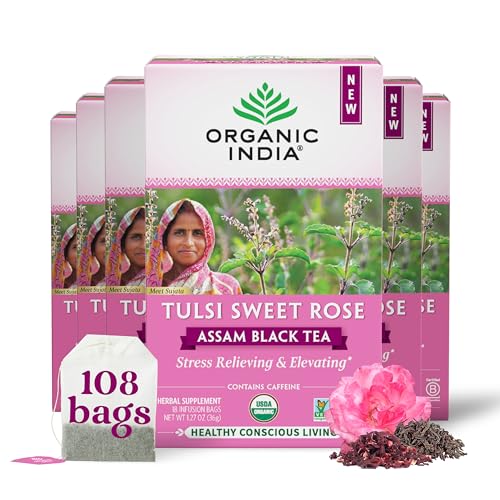 Organic India Tulsi Sweet Rose Assam Black Tea – Stress Relieving & Elevating, 17mg of Caffeine Per Cup, With Ayurvedic Herbs, Vegan, USDA Organic, Non-GMO – 18 Rose Tea Bags (Pack of 6)
